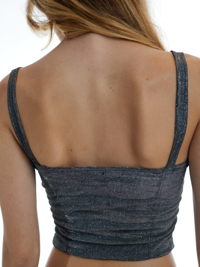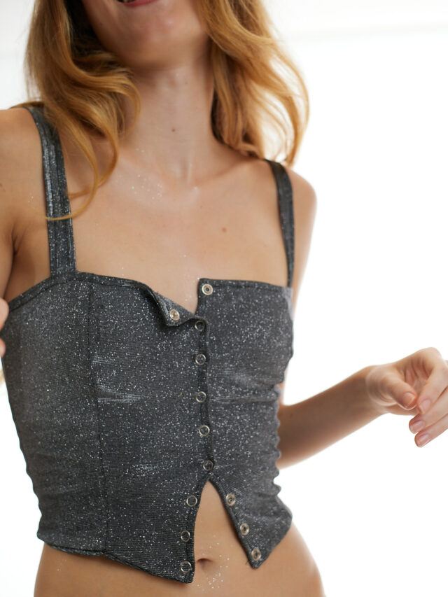 DESCRIÇÃO: Blusa corset em lycra com brilho. O modelo possui alças médias e fechamento frontal por tachinhas, que permite regular o decote conforme a proposta do look, mais fechado ou mais aberto. O caimento ajustado valoriza a silhueta, enquanto a elasticidade da lycra garante conforto e liberdade de movimento. Uma peça fresca, elegante e cheia de presença, pensada para o carnaval!