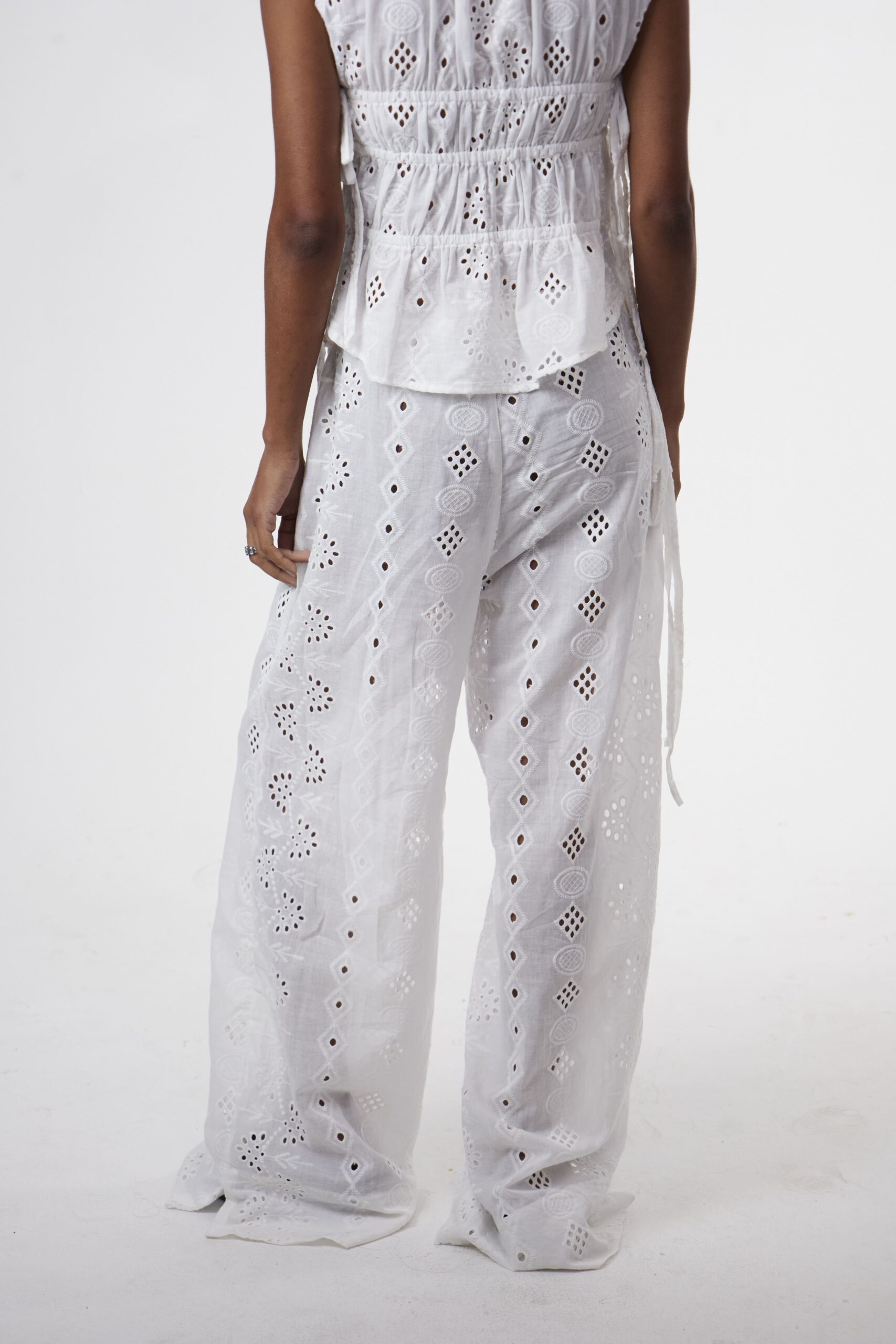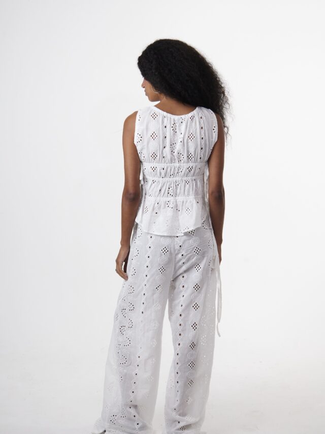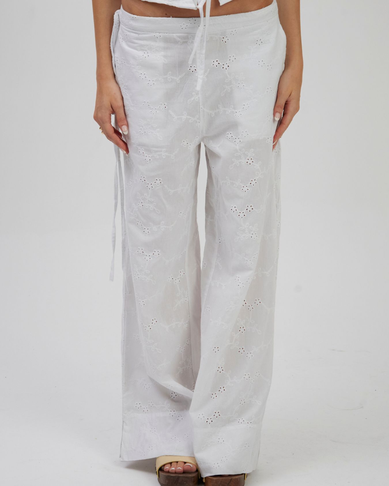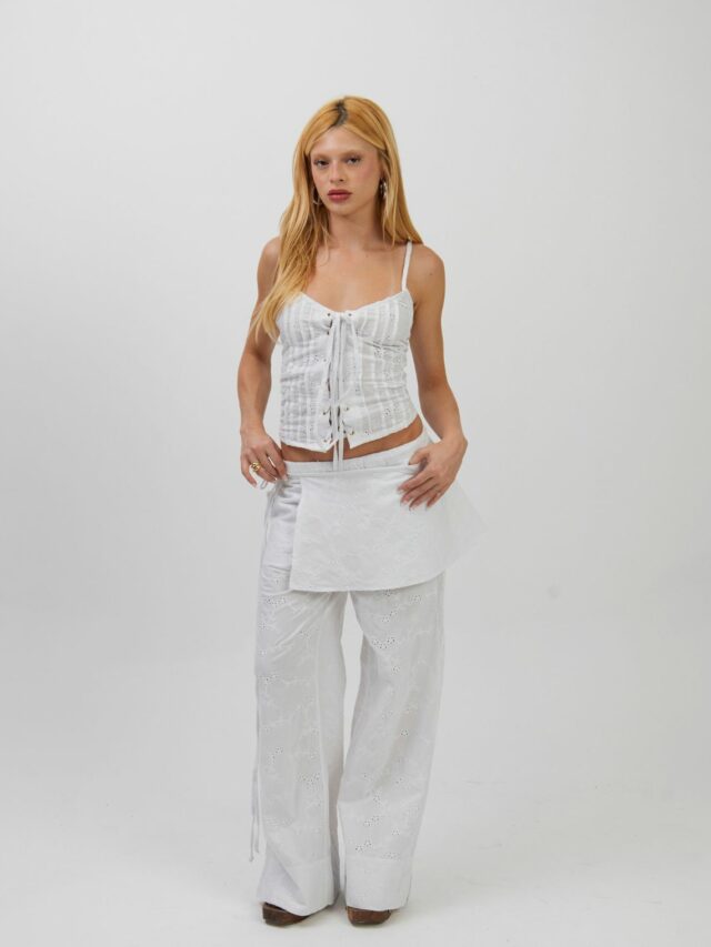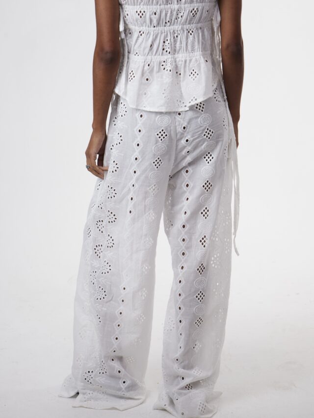 DESCRIÇÃO: Calça confeccionada em laise 100% algodão. Possui dois bolsos faca frontais e amarração lateral no cós, com elástico, podendo ser ajustada como cintura alta ou baixa. Com modelagem ampla e caimento impecável, alongando as pernas. Recomendamos comprar um tamanho menor, ou comprar seu tamanho padrão caso queira um caimento mais despojado. Pode ser usada com ou sem a sobreposição, adaptando-se a diferentes composições – do casual ao chic, do dia à noite. A calça não possui forro, podendo ser usada com calcinhas beges sem costura para não marcar.