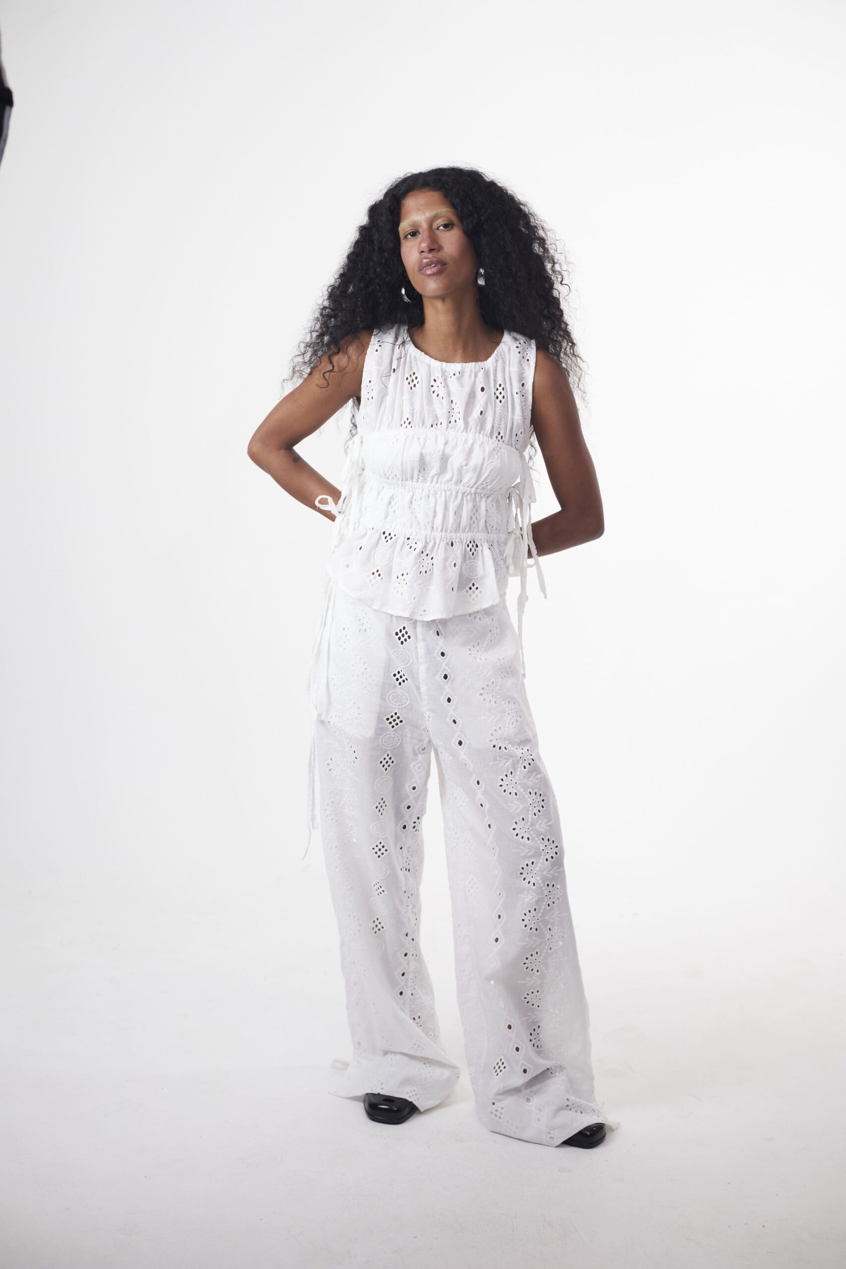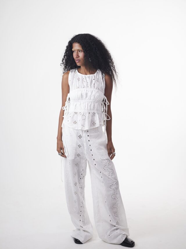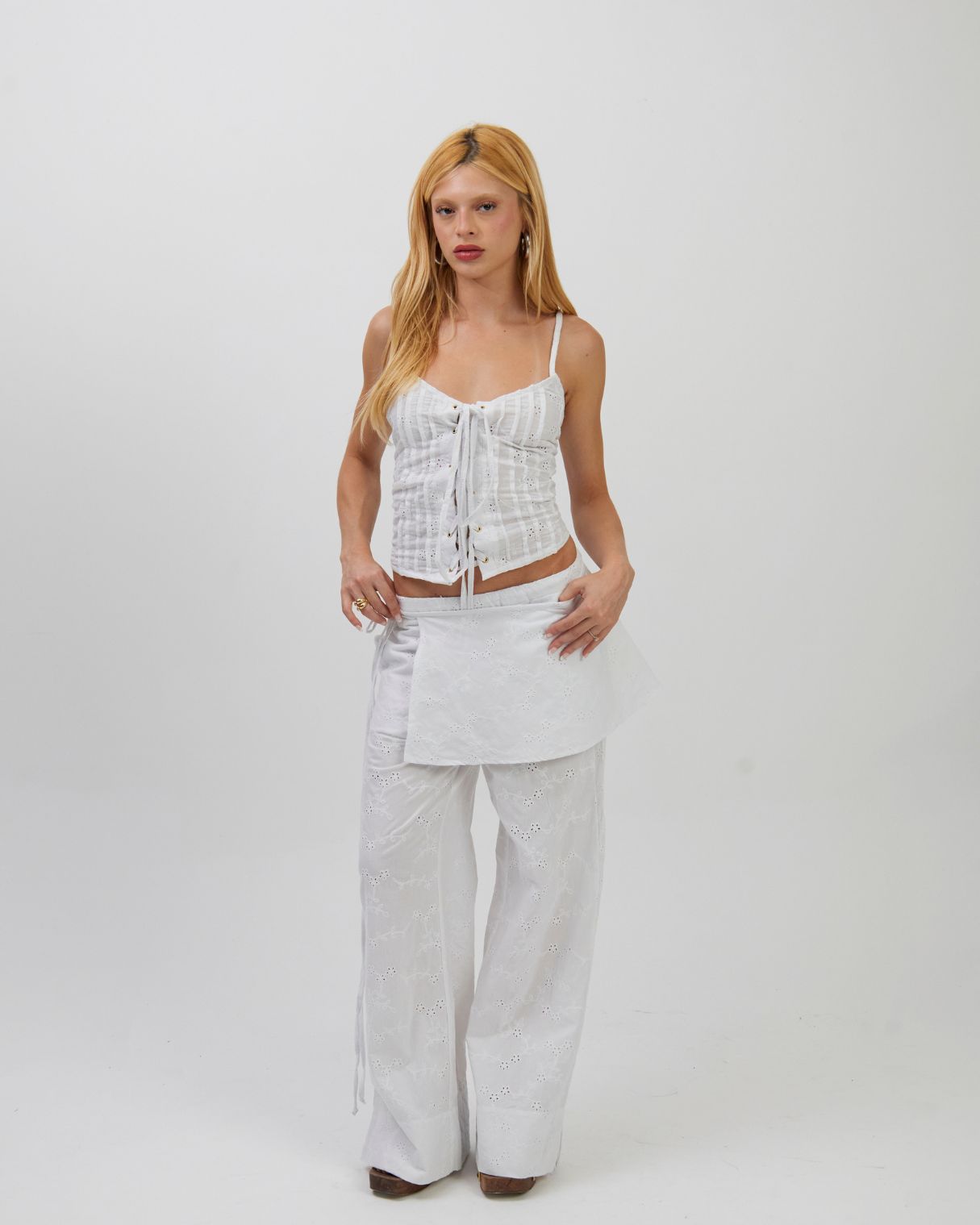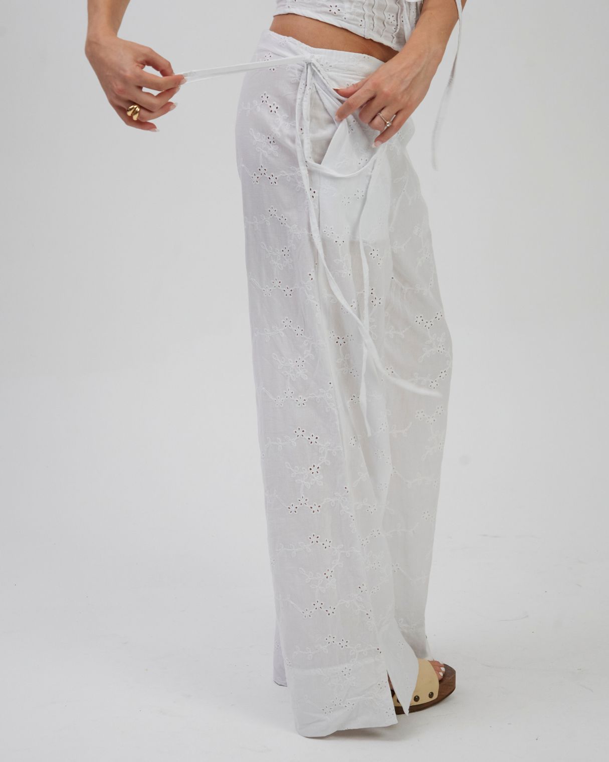 DESCRIÇÃO: Calça confeccionada em laise 100% algodão. Possui dois bolsos faca frontais e amarração lateral no cós, com elástico, podendo ser ajustada como cintura alta ou baixa. Com modelagem ampla e caimento impecável, alongando as pernas. Recomendamos comprar um tamanho menor, ou comprar seu tamanho padrão caso queira um caimento mais despojado. Pode ser usada com ou sem a sobreposição, adaptando-se a diferentes composições – do casual ao chic, do dia à noite. A calça não possui forro, podendo ser usada com calcinhas beges sem costura para não marcar.