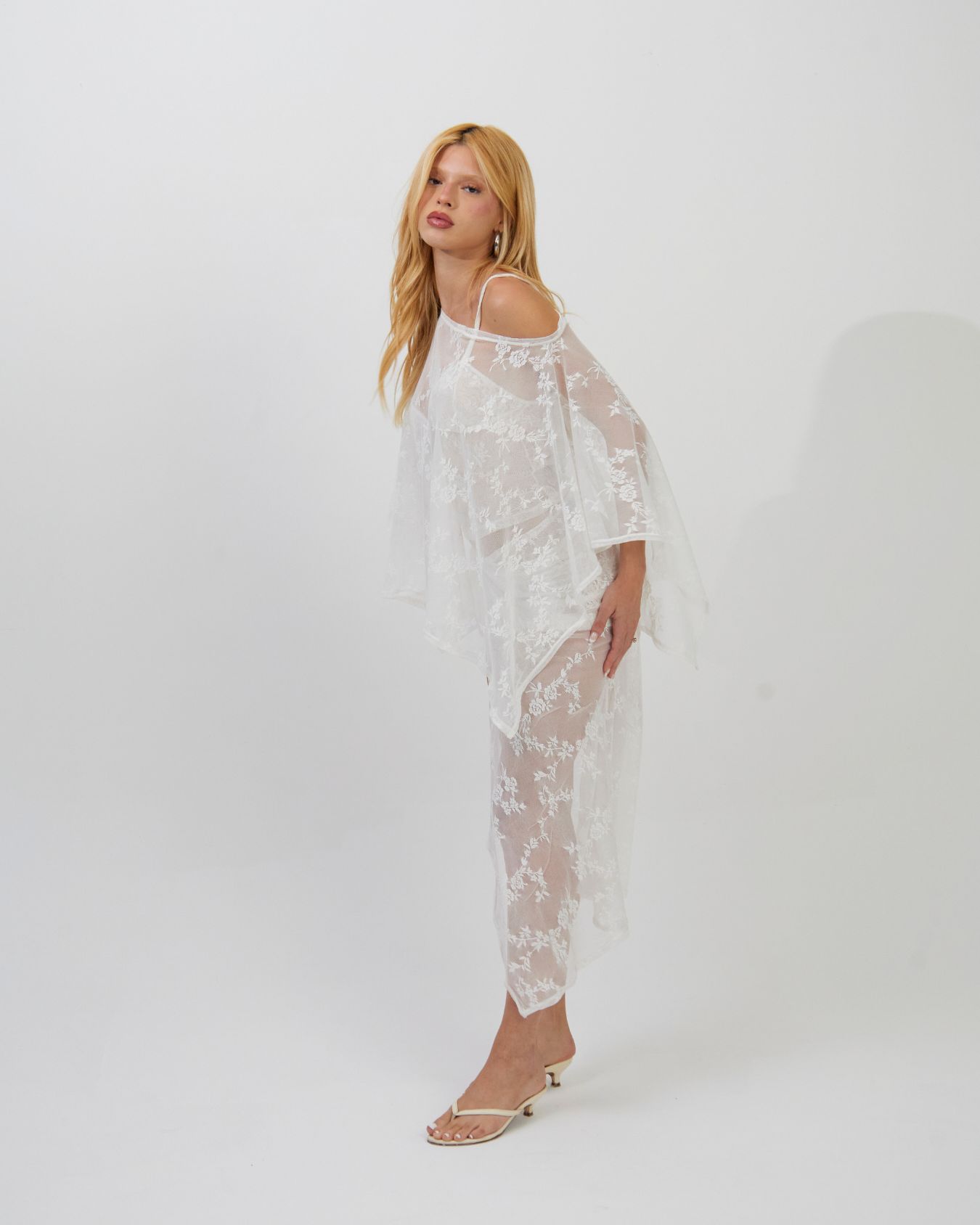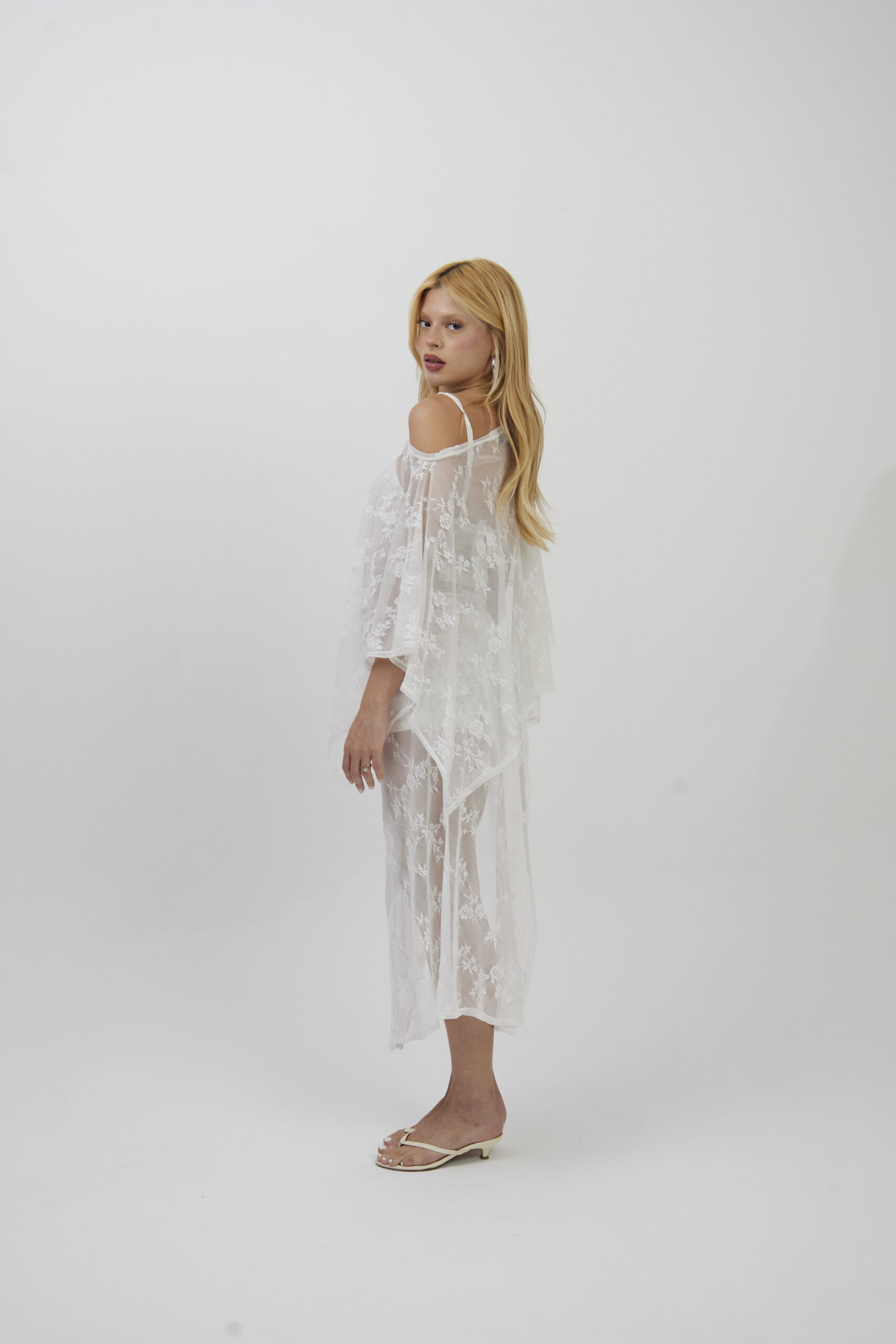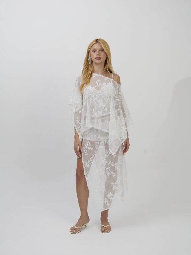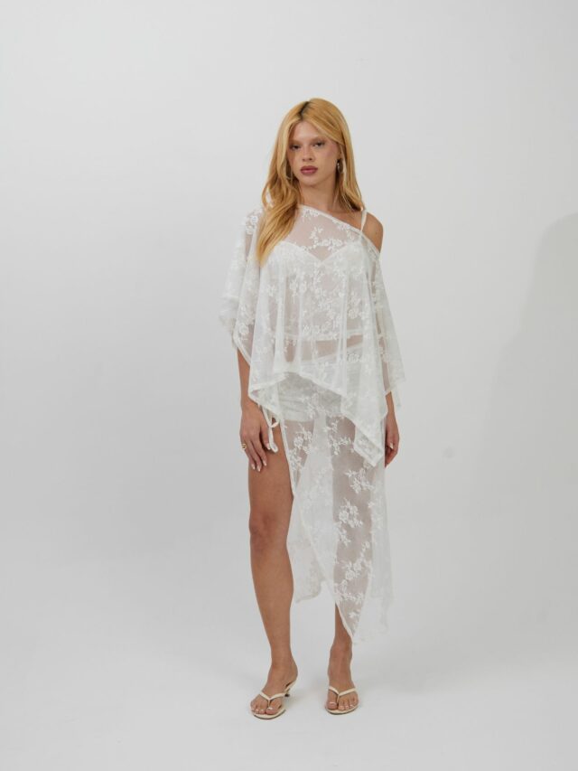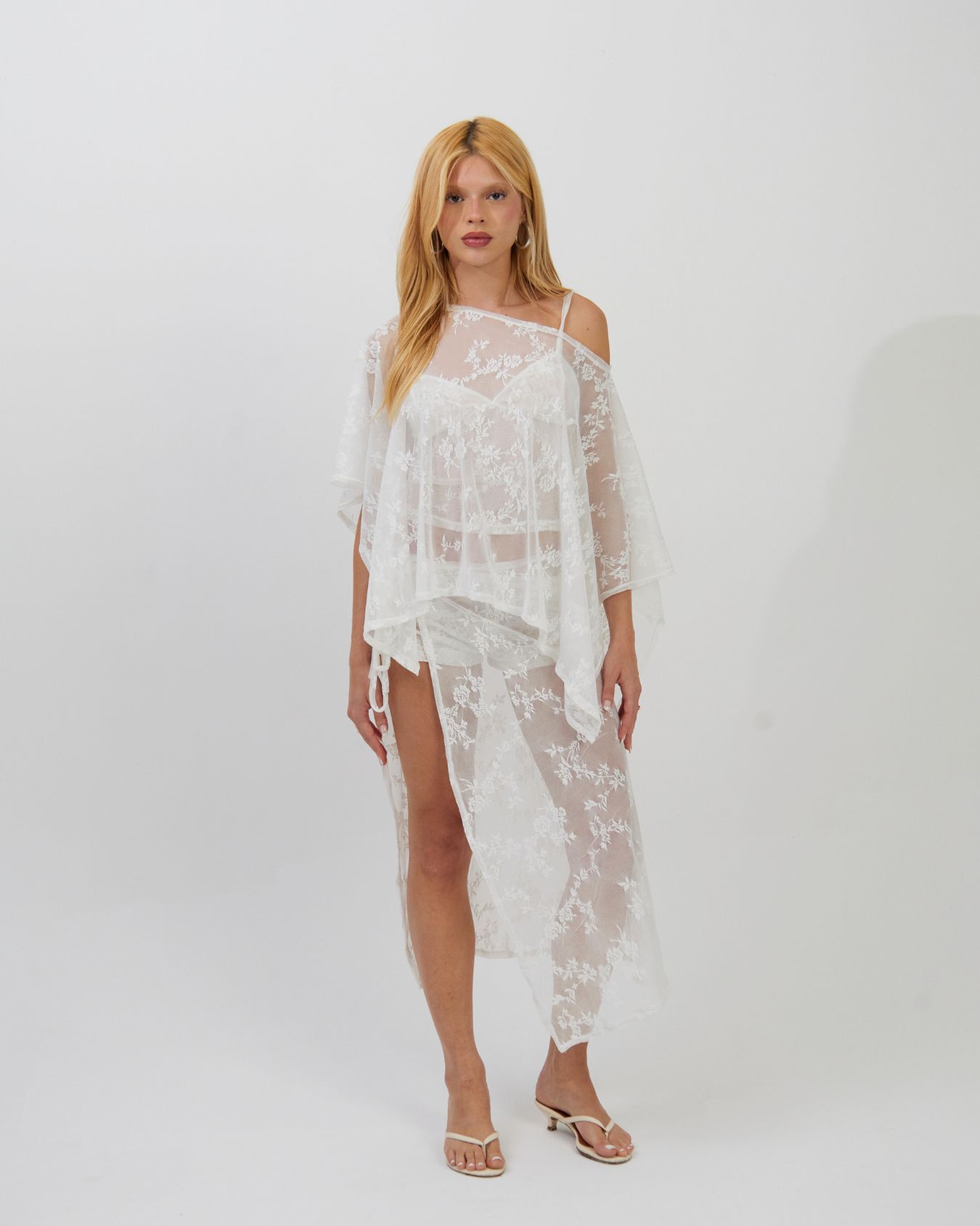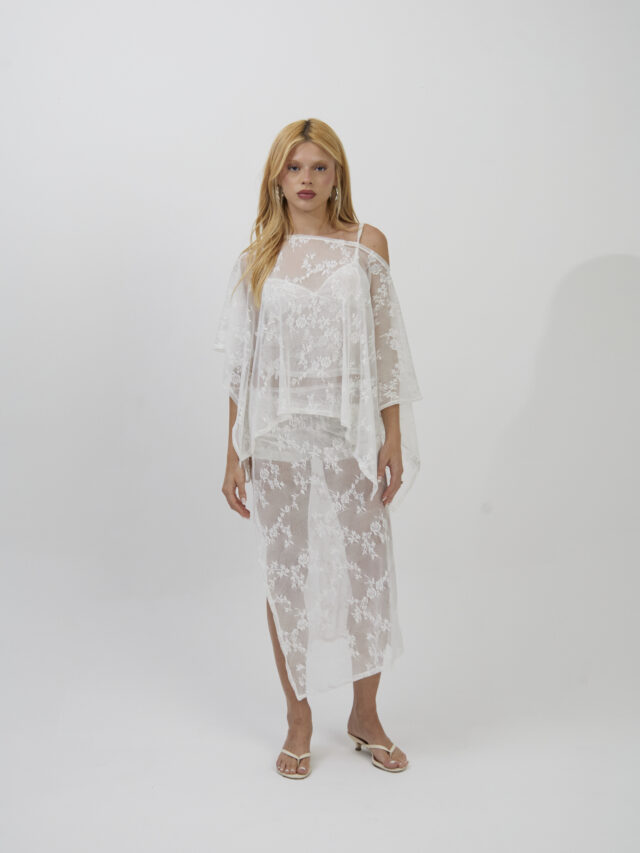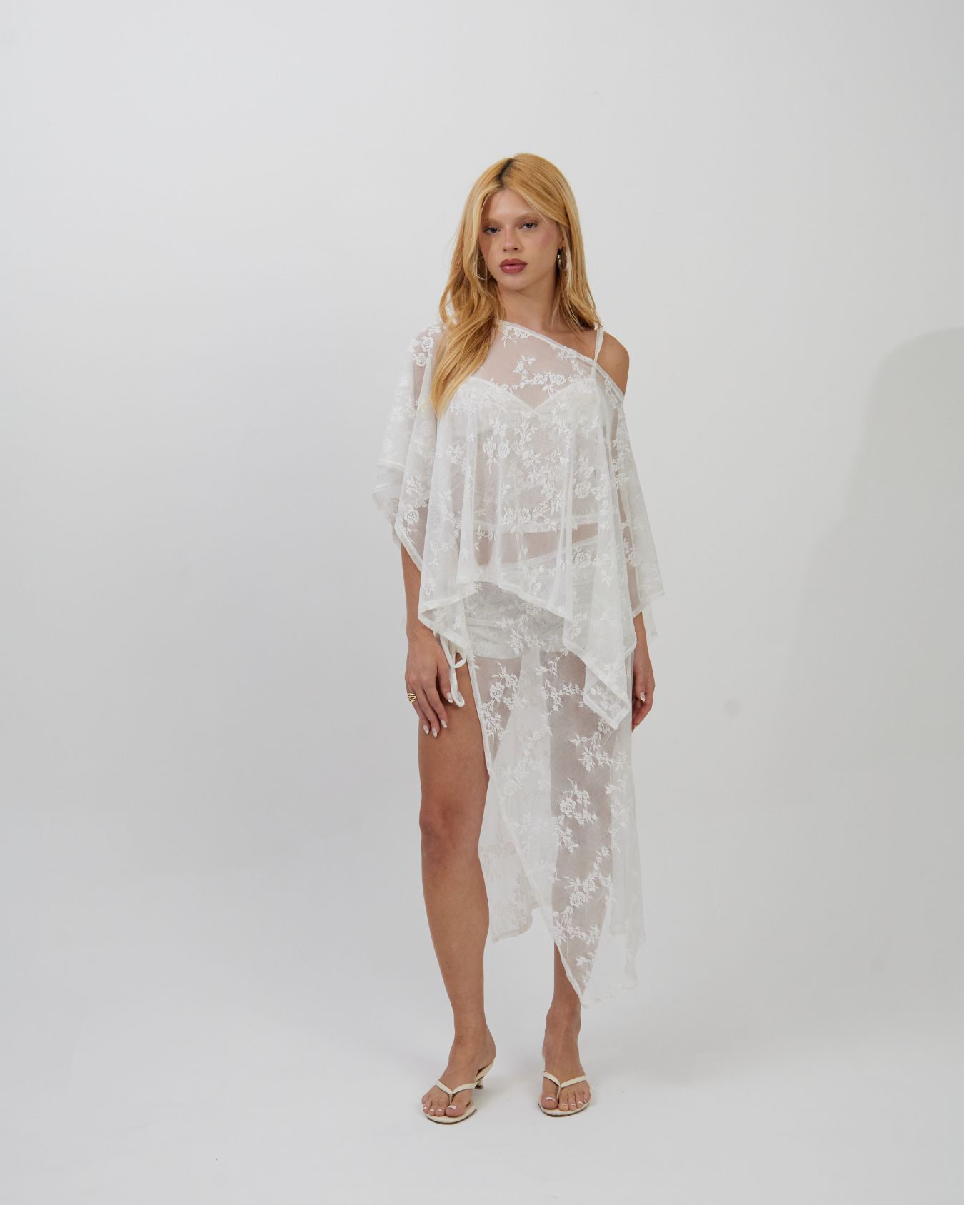 DESCRIÇÃO: Capa confeccionada em renda floral. A modelagem ampla cria movimento e permite diferentes formas de uso: ombro a ombro, assimétrica ou apenas como sobreposição. Por possuir transparência, funciona perfeitamente com biquíni e tops por baixo! Uma peça que traz textura, frescor e leveza.