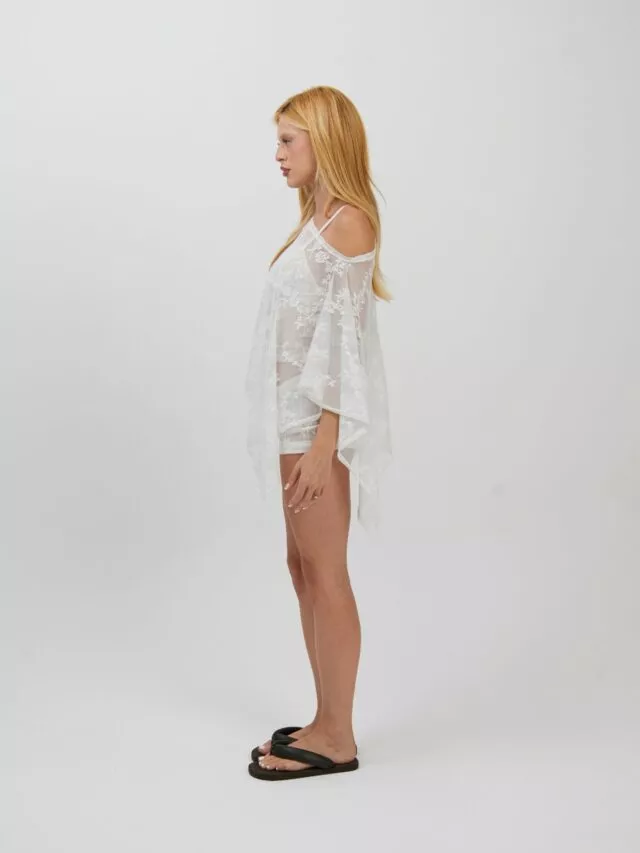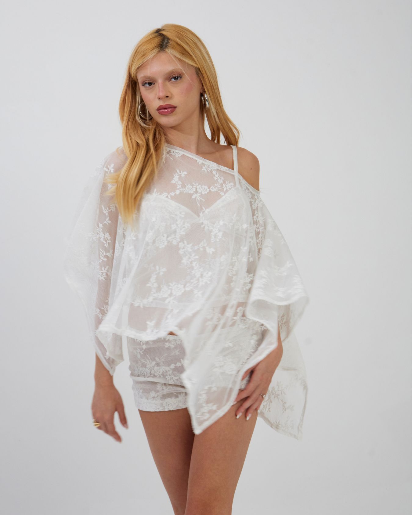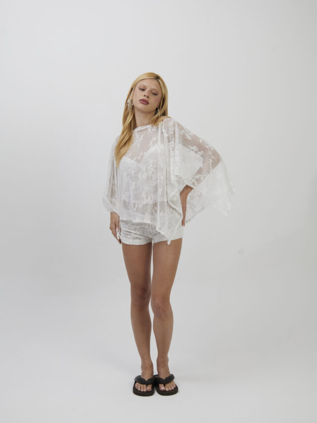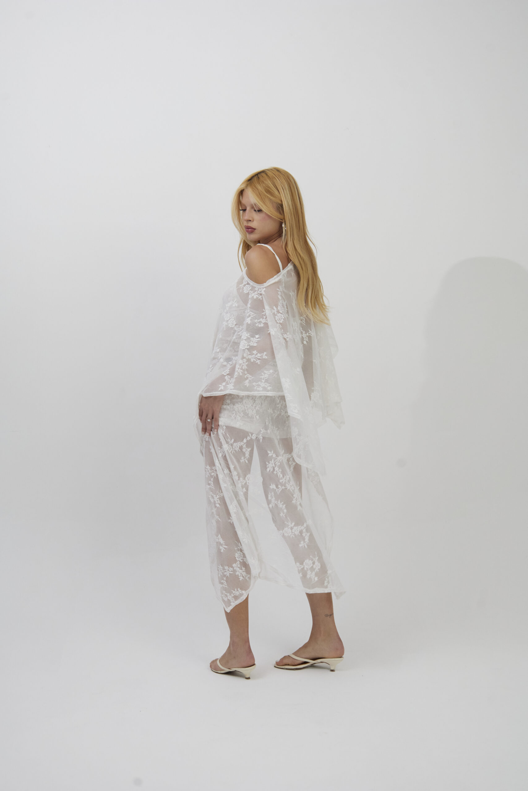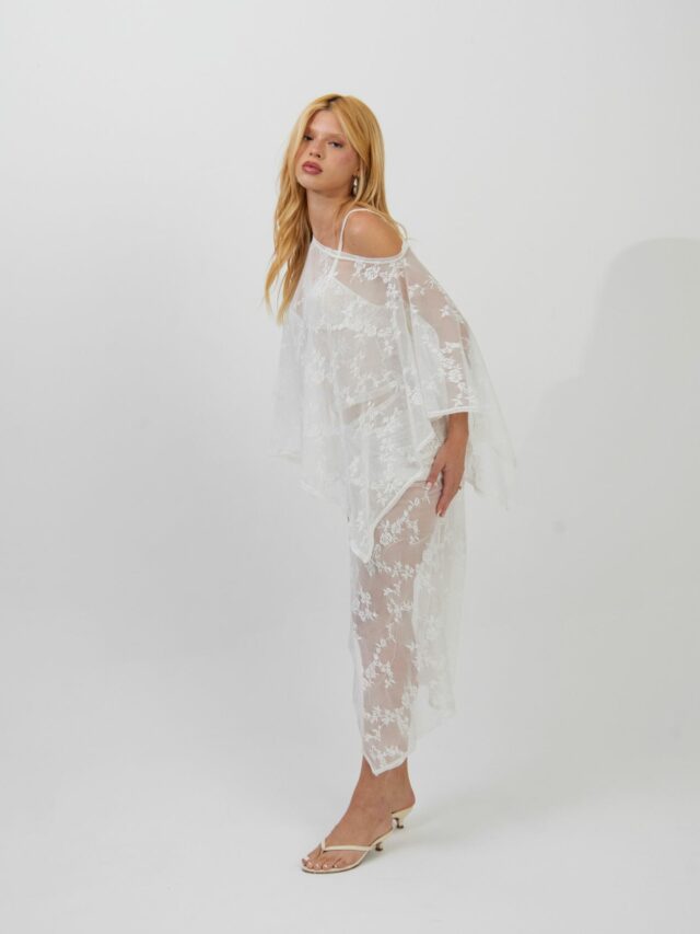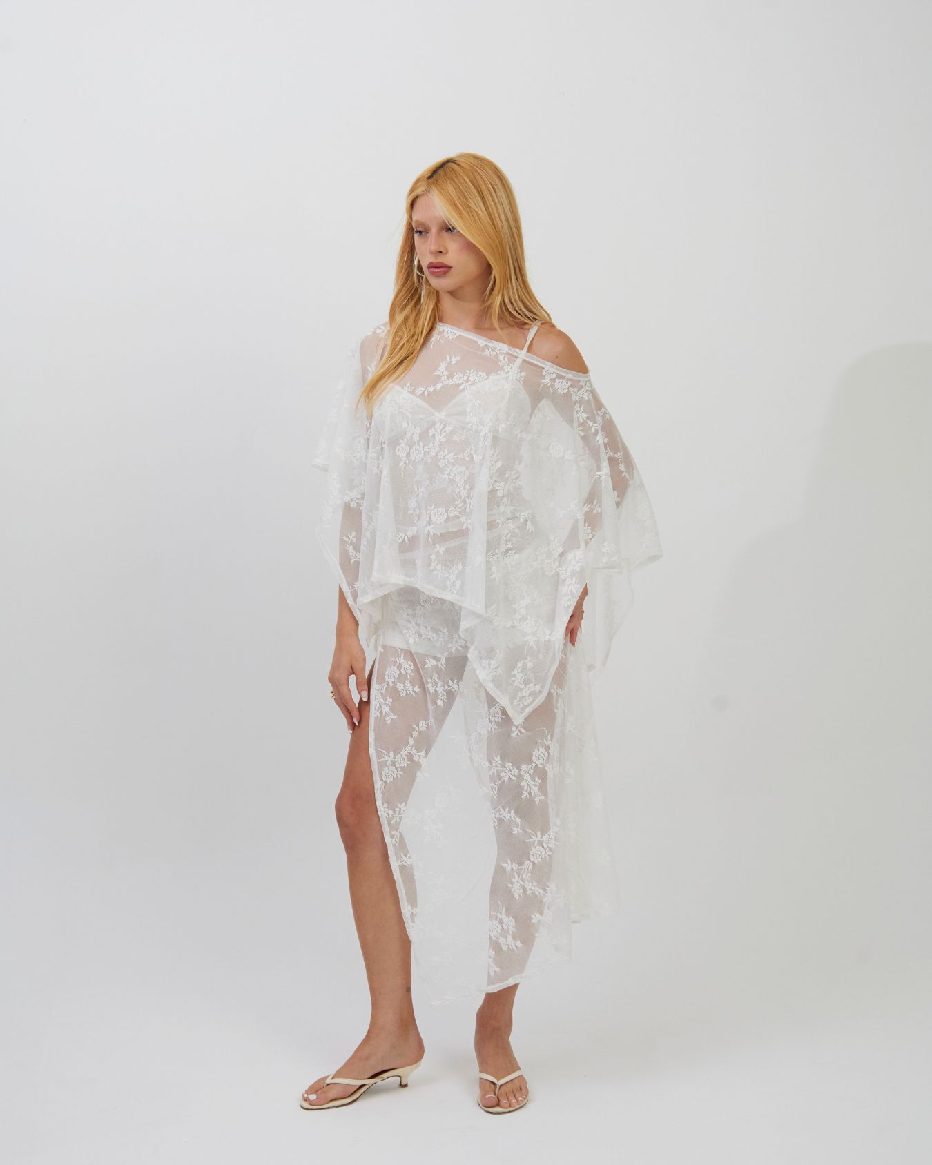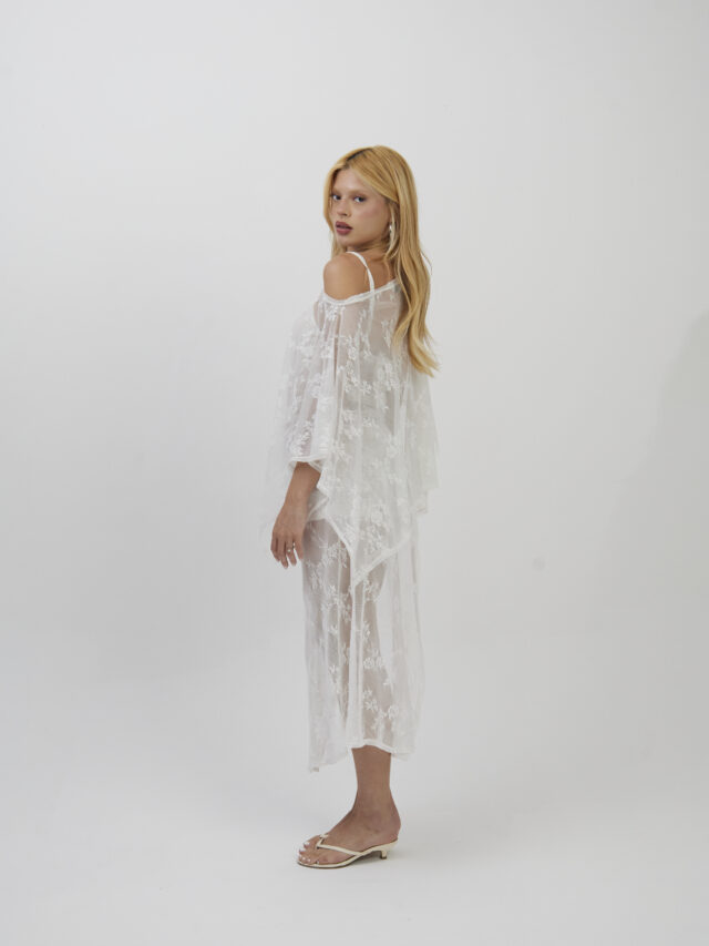 DESCRIÇÃO: Capa confeccionada em renda floral. A modelagem ampla cria movimento e permite diferentes formas de uso: ombro a ombro, assimétrica ou apenas como sobreposição. Por possuir transparência, funciona perfeitamente com biquíni e tops por baixo! Uma peça que traz textura, frescor e leveza.