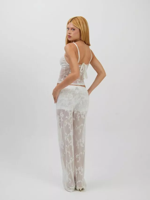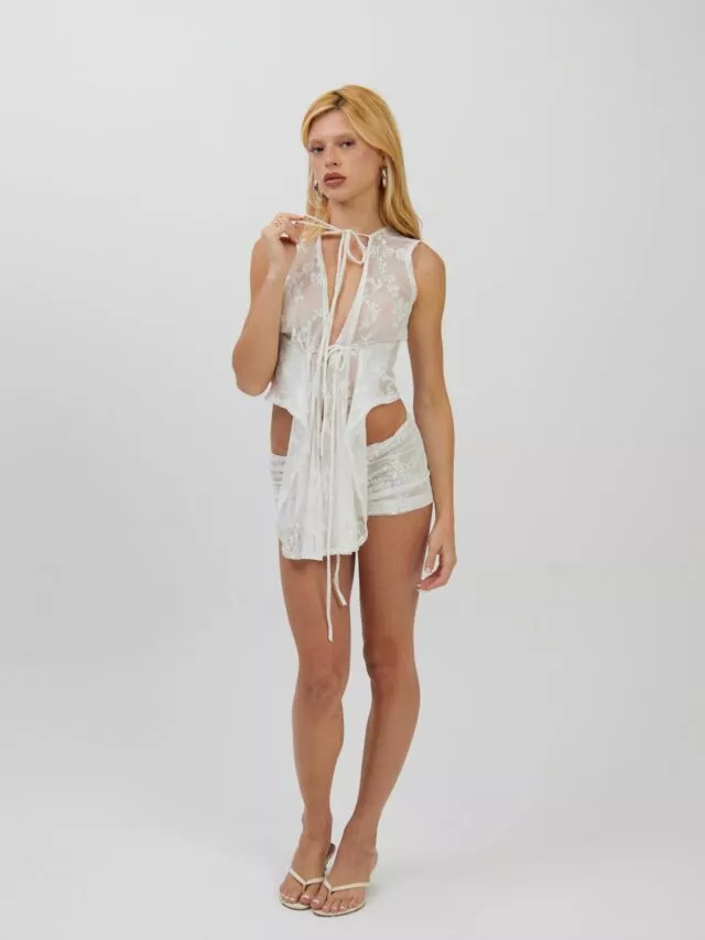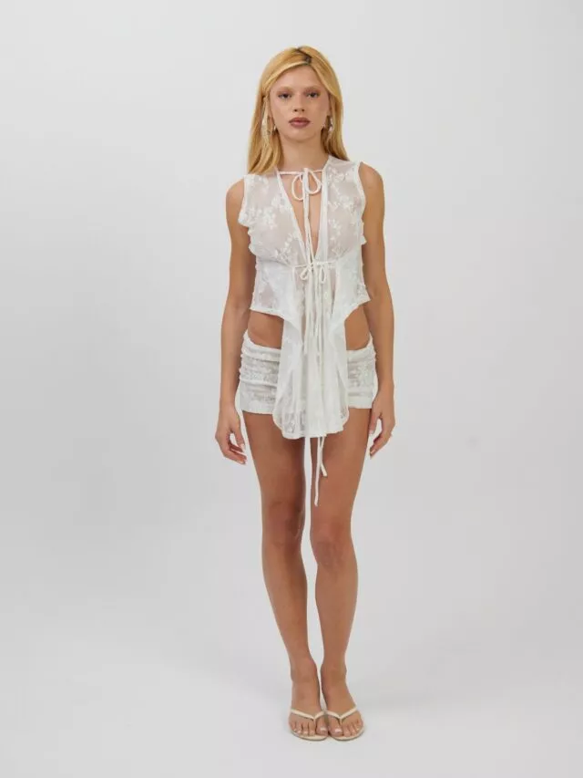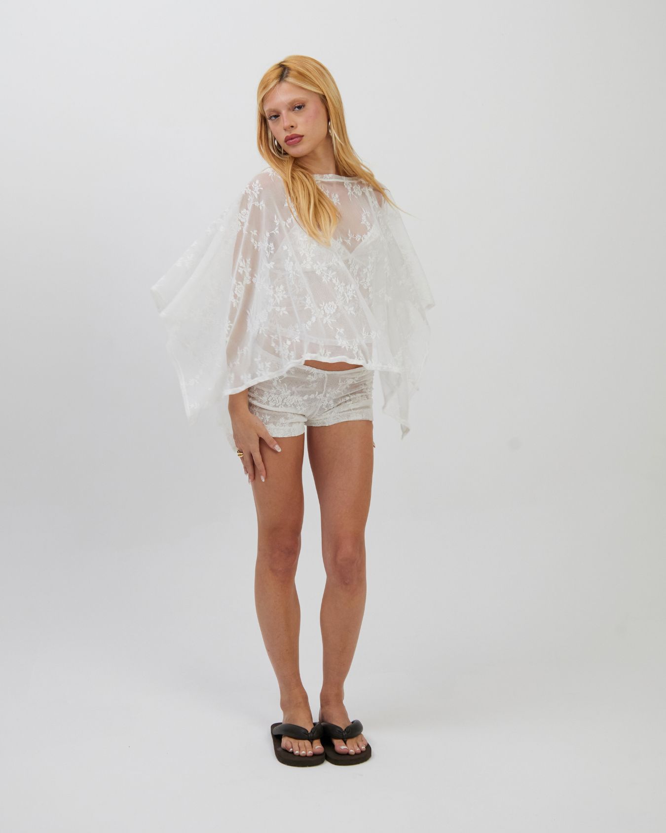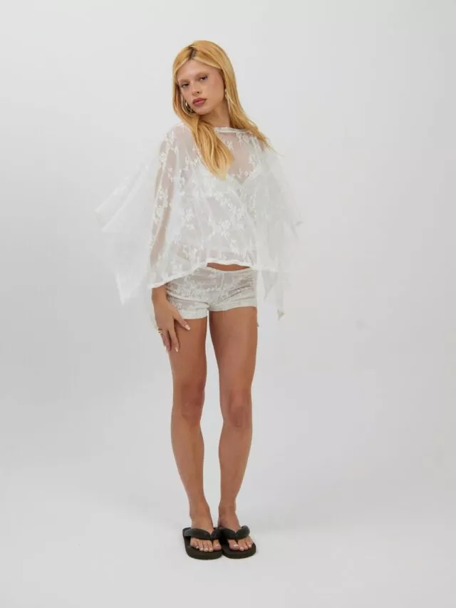 DESCRIÇÃO: Mini shorts confeccionado em renda floral. Modelagem curtinha com cintura baixa e transparência suave, ideal para usar por baixo das nossas peças em tule e renda ou para compor looks de verão com um toque romântico. Dica de ouro: fica perfeito combinado com nossa calça renda ou como base para vestidos e saias translúcidas!