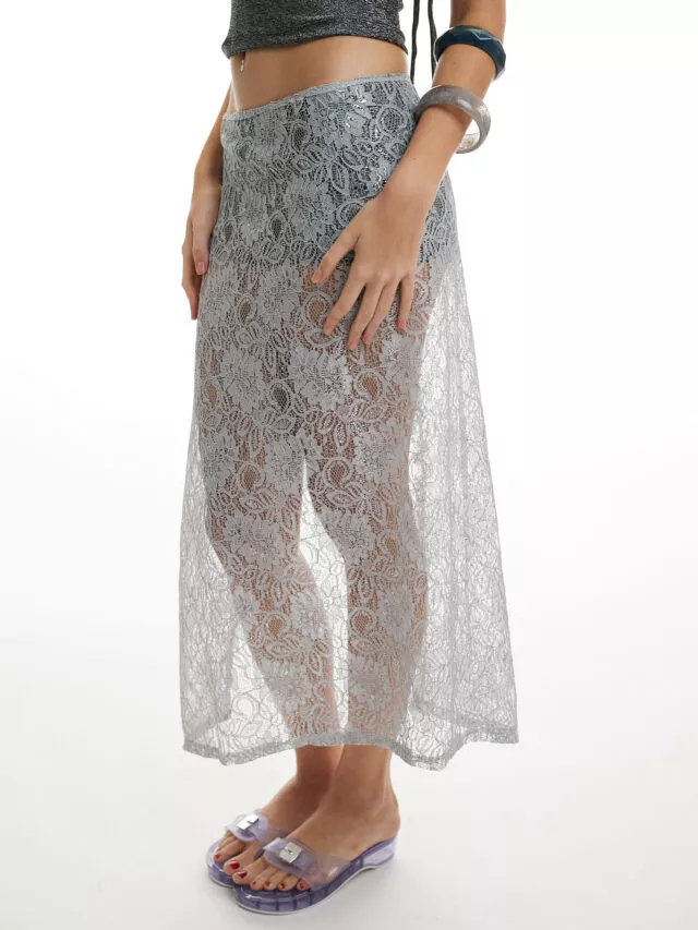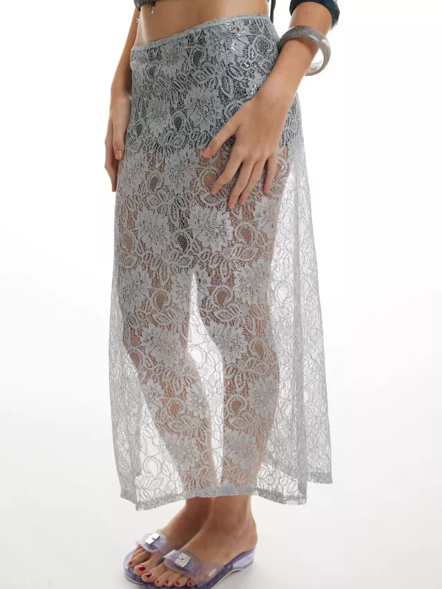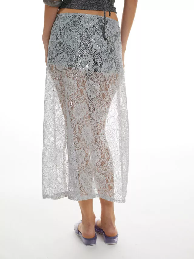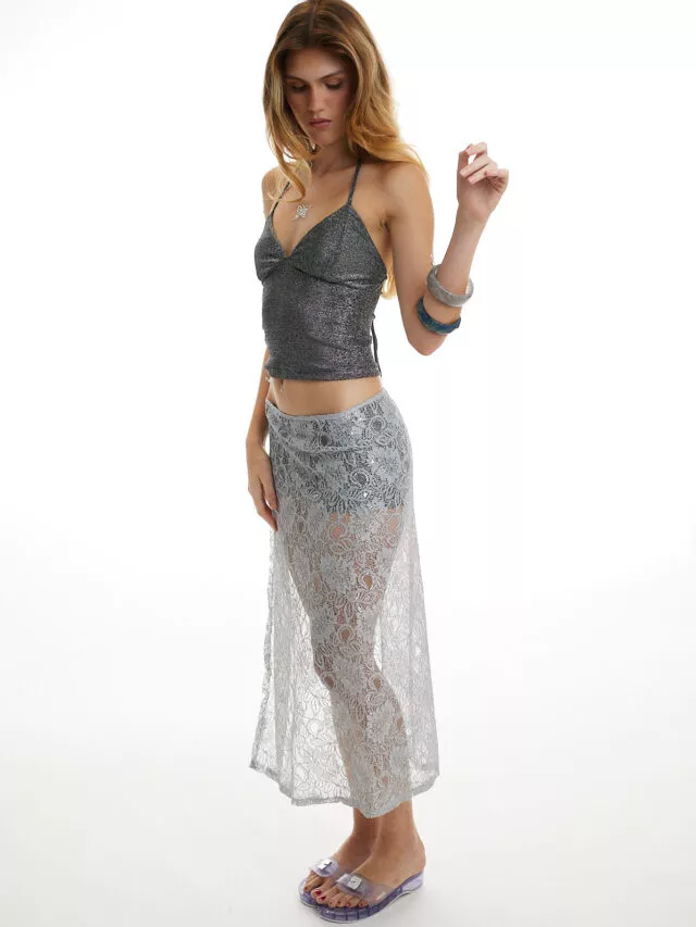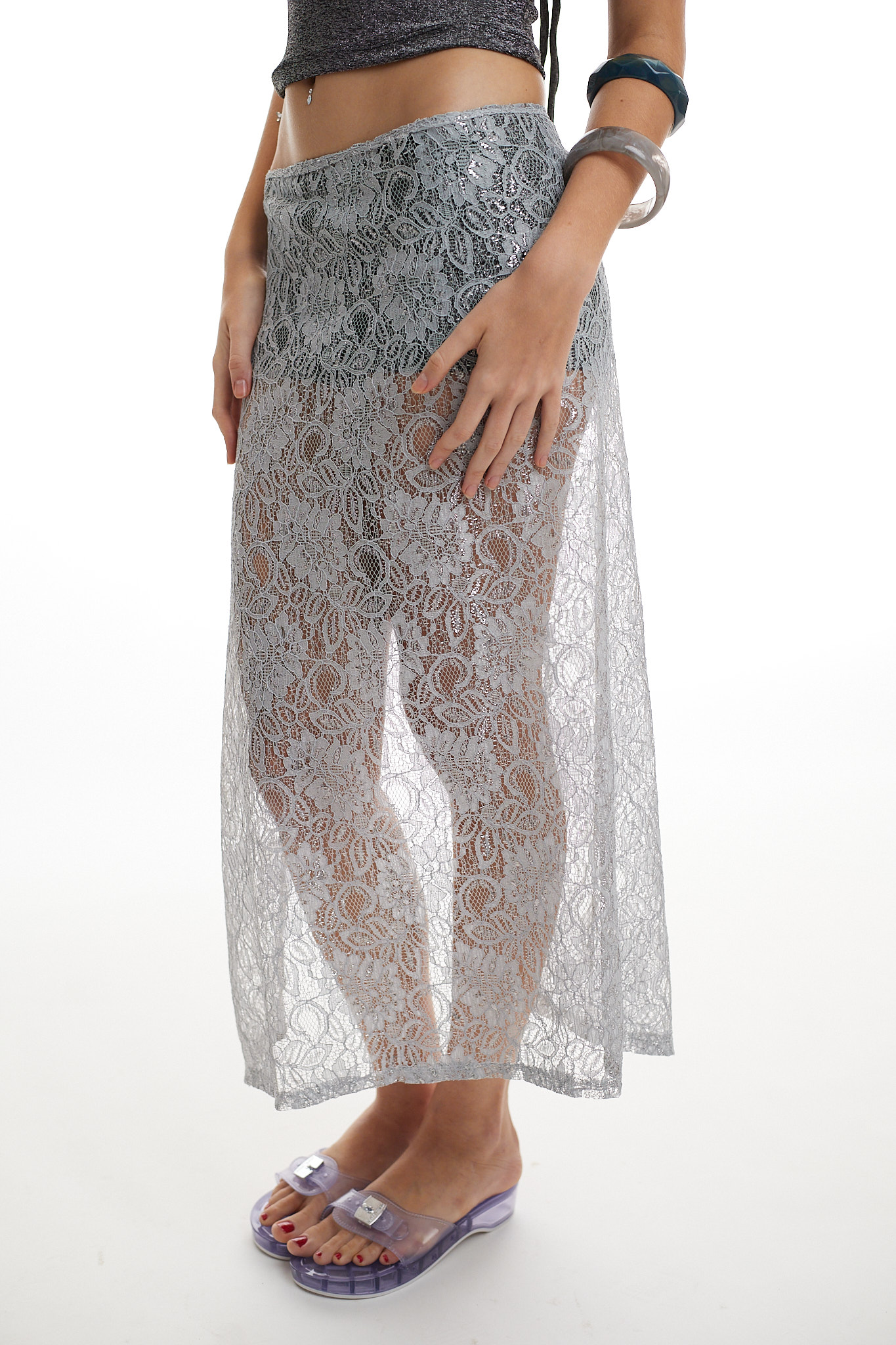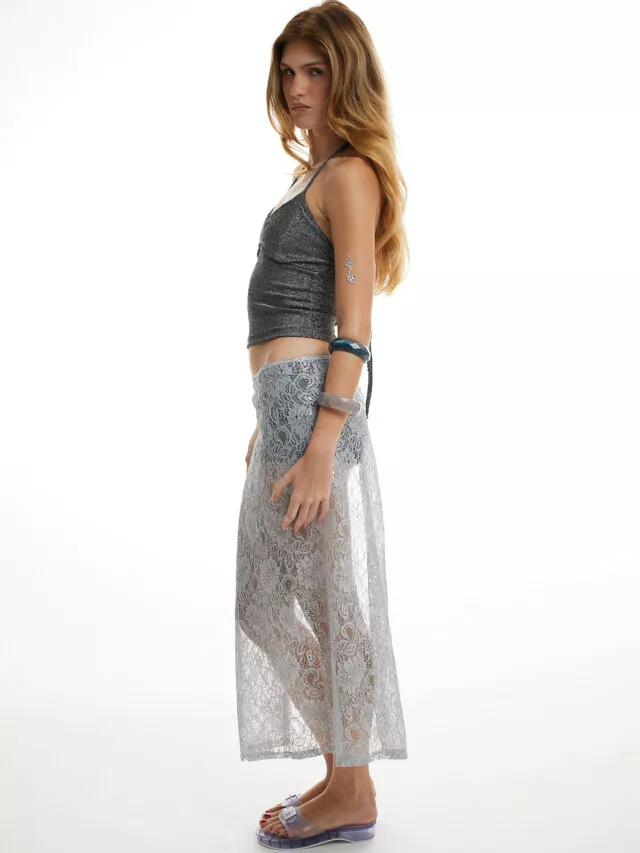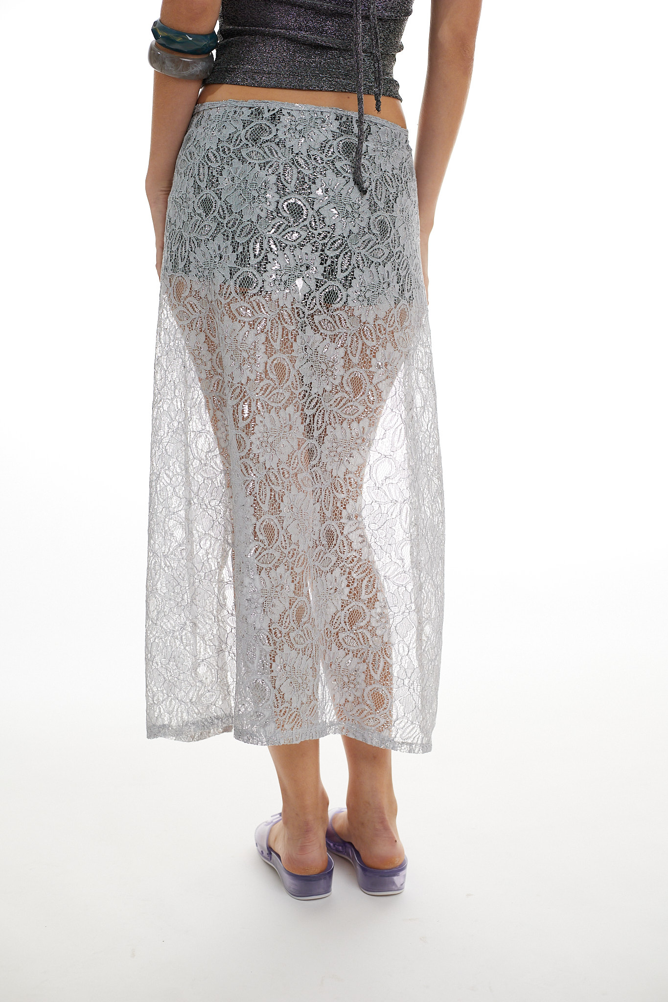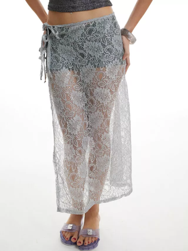 DESCRIÇÃO: A Saia Lenço Longa Renda Prata é confeccionada em renda floral com brilho, com caimento fluido e amarração lateral que permite ajuste perfeito na cintura. Pode ser usada como saia para uma composição fresh, como saída de praia ou como sobreposição para looks modernos.