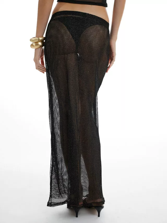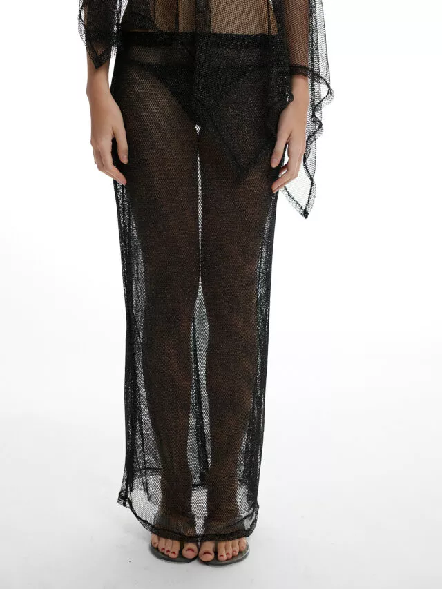 DESCRIÇÃO: Saia longa em tela com brilho, modelagem reta e caimento fluido. O cós em elástico garante conforto e praticidade, enquanto a transparência leve cria movimento. A peça ideal para composições de carnaval do dia à noite.