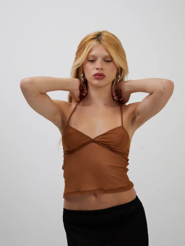 DESCRIÇÃO: Top confeccionado em tule, unindo delicadeza e um toque retrô. Possui decote em V, alças retas e amarração nas costas para um ajuste perfeito. O recorte no busto e o forro duplo garantem conforto e leveza, tornando essa a peça ideal para composições frescas e sofisticadas.