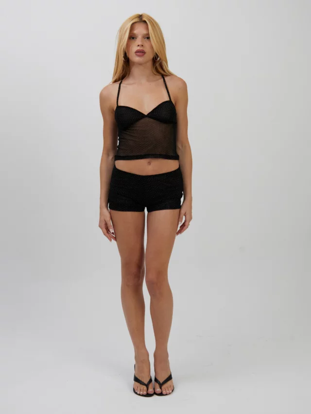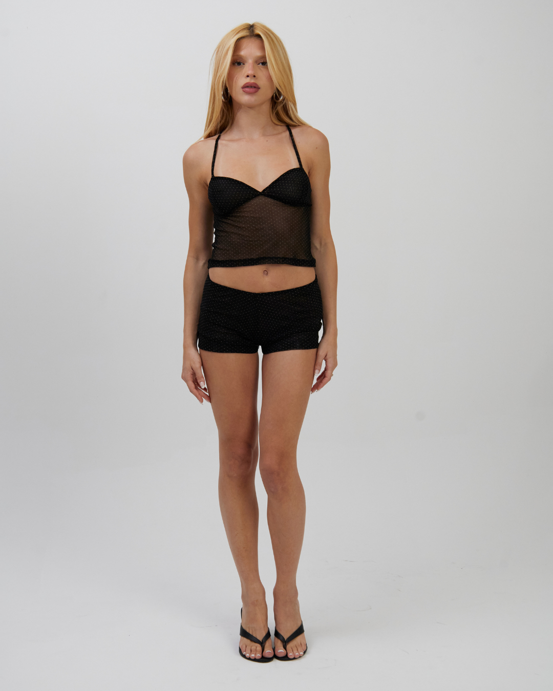 DESCRIÇÃO: Top confeccionado em tule estampado, unindo delicadeza e um toque retrô. Possui decote em V, alças retas e amarração nas costas para um ajuste perfeito. O recorte no busto e o forro duplo garantem conforto e leveza, tornando essa a peça ideal para composições frescas e sofisticadas.